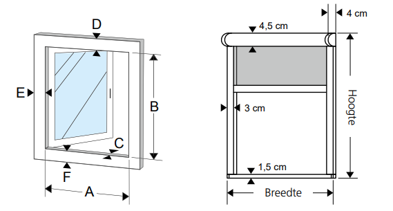 - Hoogte bij optie met sluitprofiel: dagmaat (B) + 60 mm (45 mm cassette + 15 mm sluitprofiel) = productmaat